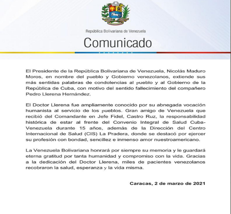 El Presidente de la República Bolivariana de Venezuela, Nicolás Maduro Moros, en nombre del pueblo y Gobierno venezolanos, extiende sus más sentidas palabras de condolencias al pueblo y al Gobierno de la República de Cuba, con motivo del sentido fallecimiento del compañero Pedro Llerena Hernández.